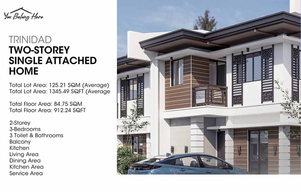 Trinidad (Single Attached House): The most spacious option, with a lot area of 125.21 sqm and a floor area of 84.75 sqm, comprising three bedrooms, three bathrooms, a balcony, kitchen, living and dining areas, service area, patio/veranda, and a two-carport.